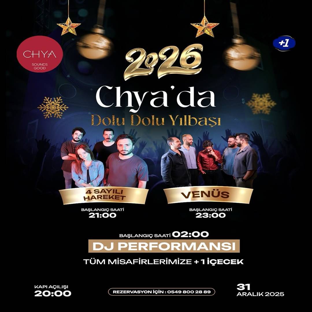 Chya Performance Hall Konya’da yılbaşı eğlencesinin merkezi olacak. 4 Sayılı Hareket ve Venüs gruplarının eğlence dolu performansları eşliğinde 2026’ya harika bir başlangıç yapmak için yerinizi ayırın.