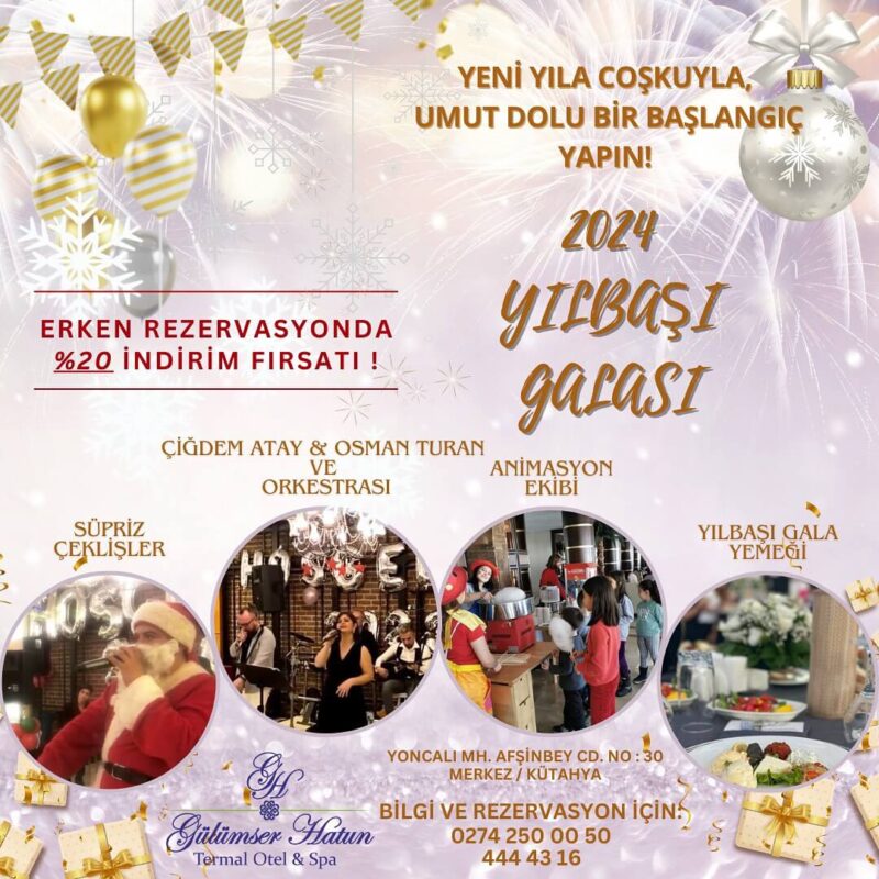 Kütahya’nın huzur yuvası Gülümser Hatun Termal Otel yılbaşı programı 2026 ile ayrıcalıklı bir yılbaşı tatili için sizlere yine harika bir yılbaşı galası hazırladı.
