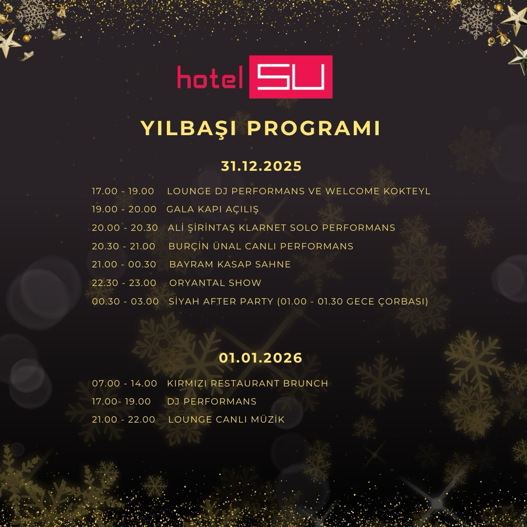 Antalya’da yılbaşı gecesini benzersiz bir atmosferde kutlamak isteyenler için Hotel SU, 2026 Yılbaşı Galası’nda ünlü sanatçı Bayram Kasap’ı ağırlıyor. Canlı müzik performansları, zengin yılbaşı menüsü, özel gala programı ve sabaha kadar devam eden after party ile misafirleri eksiksiz bir yılbaşı deneyimi bekliyor.
