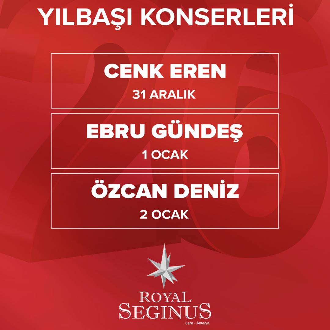 ntalya Lara'daki Royal Seginus yılbaşı için sizlere muhteşem bir konser maratonu hazırladı. Cenk Eren yılbaşı konseri ile yeni yıla muhteşem bir başlangıç yapabilirsiniz. Oteldeki yılbaşı şöleni bununla da sınırlı değil. Royal Seginus yılbaşı sahnesinde 1 Ocak'ta Ebru Gündeş, 2 Ocak'ta ise Özcan Deniz hayranlarına unutulmaz anlar yaşatacak.
